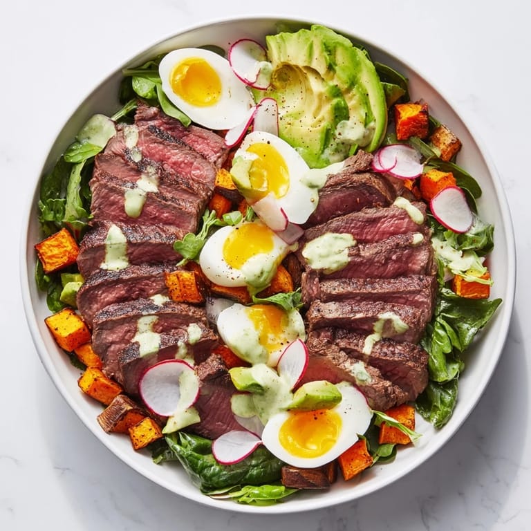 Save I discovered this bowl on a Tuesday when I had leftover roasted sweet potato and a perfectly ripe avocado sitting on my counter, practically daring me to do something interesting with them. The idea of building layers—greens first, then the warm and cool components—felt like arranging a edible landscape. There's something almost meditative about assembling a bowl where every element keeps its own texture and personality instead of getting lost in a sauce. That first bite, where the jammy egg yolk catches the citrusy dressing and mingles with the beef? That's when I knew this wasn't just lunch.