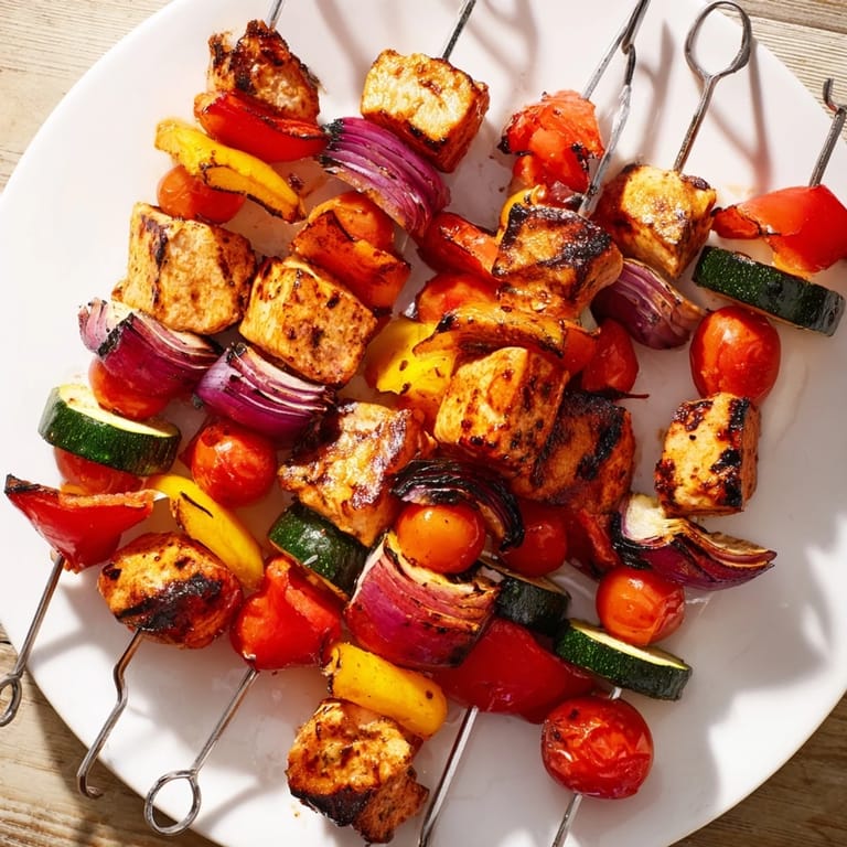 Bell peppers, zucchini, cherry tomatoes, and red onions hold well on skewers and grill evenly, adding color and flavor.