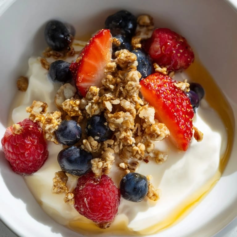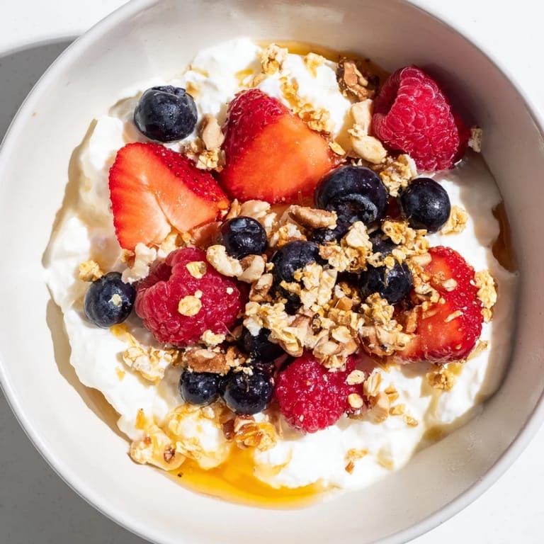 The beauty of this bowl is that it adapts to whatever you have or whatever you're craving that morning. Greek yogurt brings tang and thickness, ricotta adds a different kind of creaminess, and even mascarpone works if you're feeling indulgent. The berries can rotate with the seasons—fresh ones in summer, frozen and thawed in winter when fresh feels impossible. And the granola is your variable too; some days you want something nutty and seeded, other days something chocolate-studded feels right.