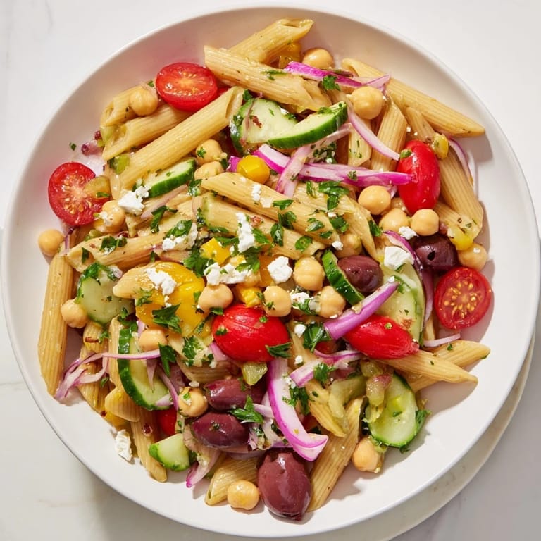 Save I used to think pasta salad meant a mayo-heavy bowl from the deli counter, so I avoided it for years. Then a neighbor brought this version to a summer potluck, and I watched her toss it together in minutes β no cream, no fuss, just bright vegetables and good olive oil. The chickpeas made it hearty enough to eat as a real meal, and the lemon kept everything tasting clean. I asked for the recipe on the spot.