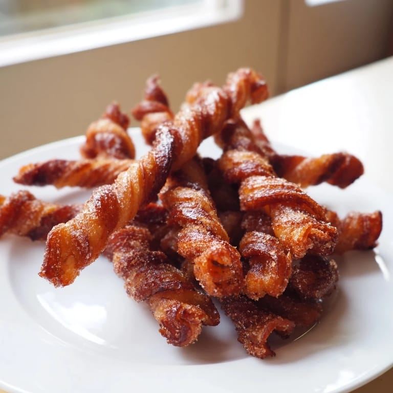 Save My neighbor knocked on my door one Saturday morning with a plate of these glistening bacon twists, still warm and crackling between her fingers. She'd made them for a brunch she was hosting and wanted my honest opinion before serving them to guests. One bite and I understood why she looked so proud—the bacon was impossibly crispy, shattered like glass, while the cinnamon sugar had caramelized into this deep, burnished crust that somehow tasted both sweet and savory at once. I pestered her for the recipe that same afternoon.